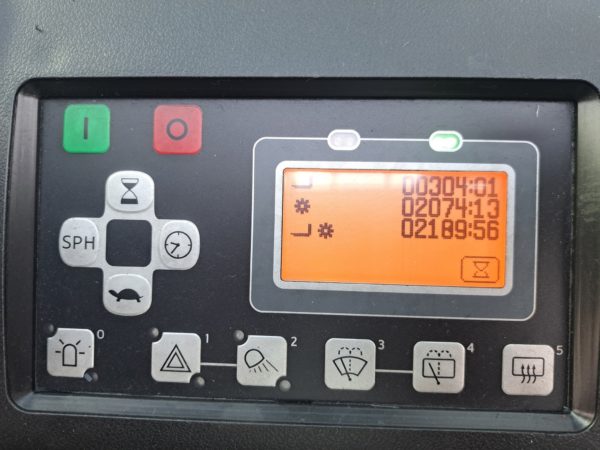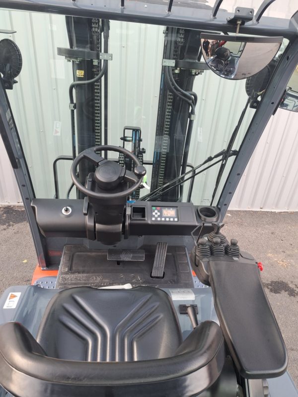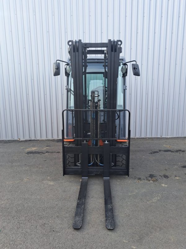 - Mât Triplpex 4700mm / Fourches 1100mm / Dosseret de charge hauteur 1200mm / TDLI / 3 voies hydrauliques / PPS AV/AR / Rampe de feux avant à led / Rampe de feux ar à led / 1 phare de travail ar à led / Gyrophare fixé au dessus du toit / Bip de recul / 2 rétroviseurs sur les côtés / Rétroviseur panoramique / Multidiplay Deluxe / Mini leviers / Sélecteur de direction sur l'accoudoir / Siège ORS en simili cuir / Cabine sans porte / blue spot ar / Pupitre A4 / E-bar / Batterie plomb 775Ah / Chargeur triphasé haute fréquence 12 heures